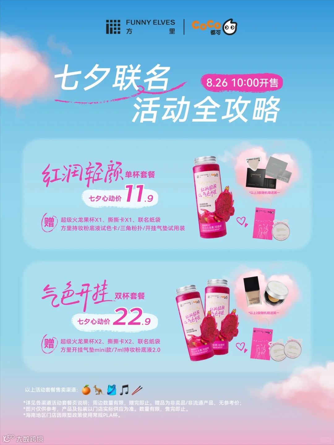 8月26日七夕限定联动开启,CoCo与美妆品牌方里合作推出联名周边,包含纸袋、撕撕卡及随机美妆小样(持妆粉底液试色卡、三角粉扑、开挂气垫试用装)。果茶与美妆双重福利,满足年轻消费者多元需求。