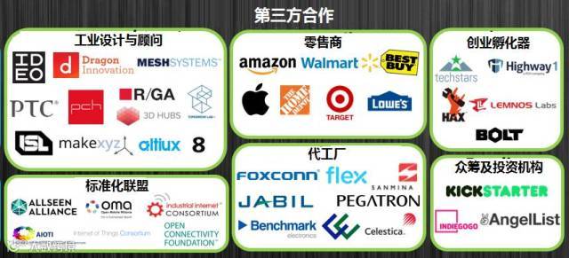 4、第三方合作伙伴:工业设计与顾问、标准化联盟、零售商、代工厂、创业孵化器、众筹及投资机构。