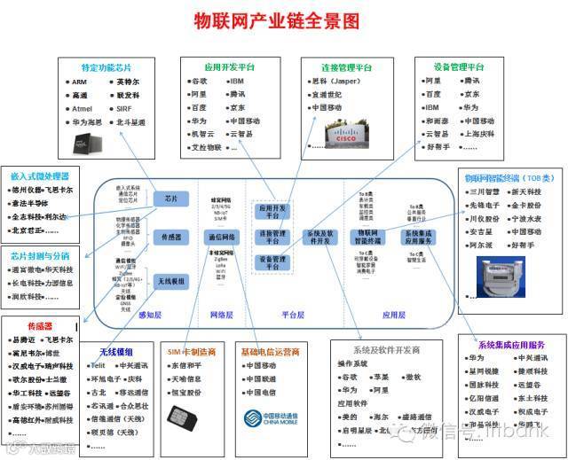 根据这四个层次,物联网的产业链又大致可分为八大环节:芯片提供商、传感器供应商、无线模组(含天线)厂商、网络运营商(含 SIM 卡商) 、平台服务商、系统及软件开发商、智能硬件厂商、系统集成及应用服务提供商。