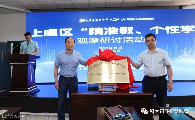 一千个孩子有一千种个性,想要因材施教,离不开大数据技术的支撑。在科大讯飞的协助下,上虞区实验中学建成了大数据个性化学习服务中心,并在活动期间举行了授牌仪式。绍兴市上虞区实验中学校长夏奎刚以及科大讯飞浙江教育行业总监王友银作为双方代表上台揭牌。