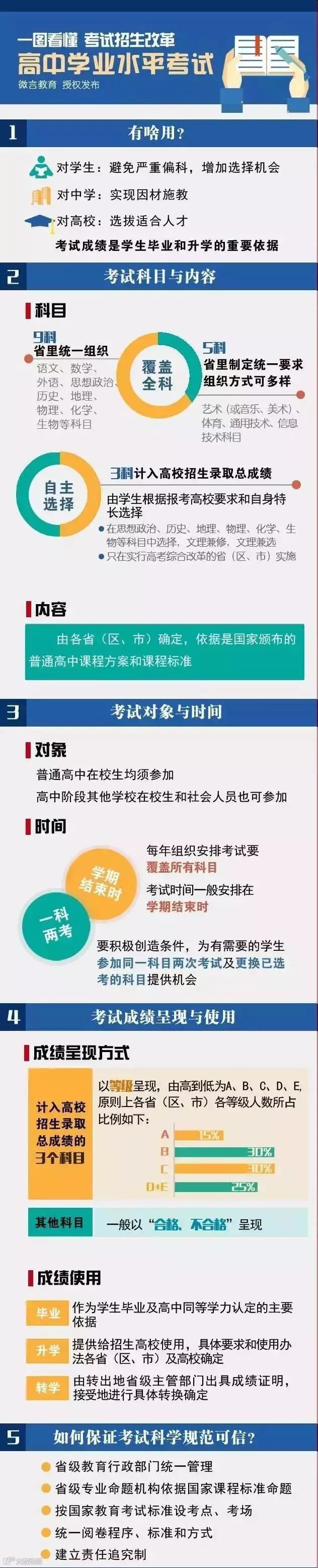 高中学业水平考试的课程标准、考试规定是国家制定的,由省级教育行政部门组织实施;考试覆盖全部14个学科,其中9科省级统一组织考试、其余科目考试的要求是全省统一的;考试科目可以6选3、7选3等。为了淡化分数,成绩分为5等。从各地公布的方案来看,实施“既看分,又看人”的综合评价录取,是未来高校招录的大势所趋。