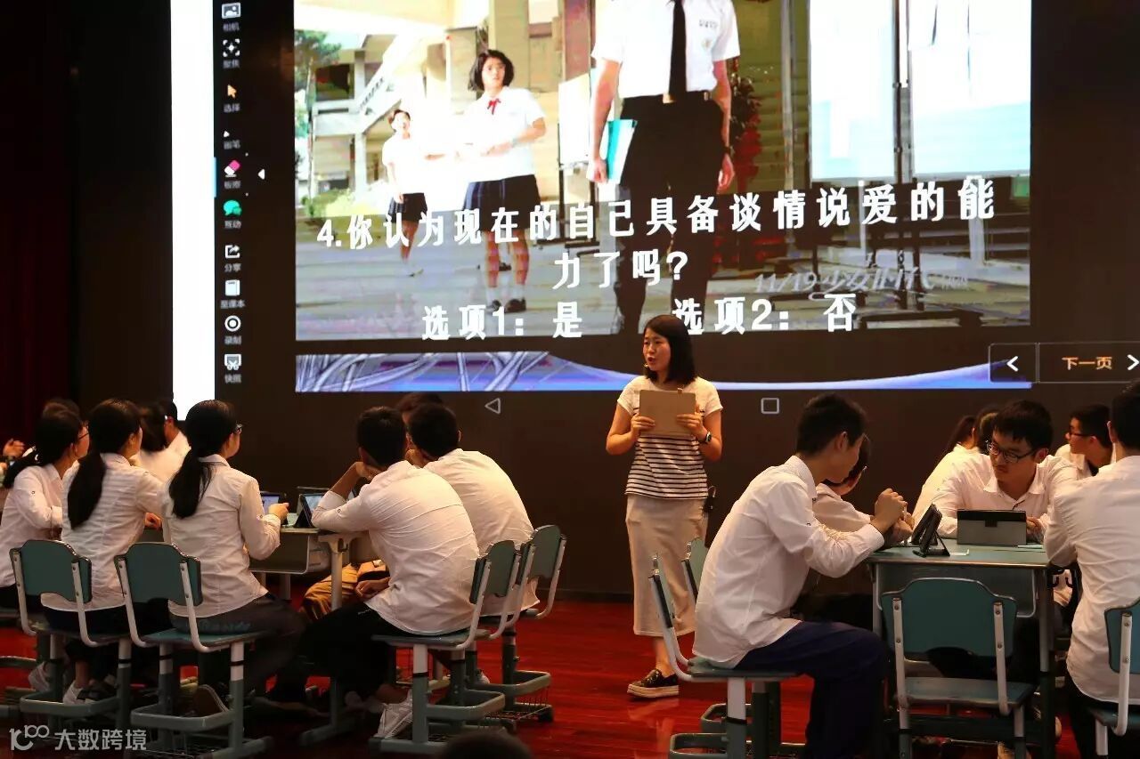 徐文君老师的心理学课上采用科大讯飞畅言智慧课堂产品,真正实现了教师备、授、改、考、导一体化。这堂课讲的是高中生常见的情感萌动现象。课上,徐老师通过教师机快捷地调用音乐和影视片段,帮助表达和解说;并在影视片段中随时插入分析和提问,通过学生的作答循循引导学生自己体会,大大提高了上课效率。