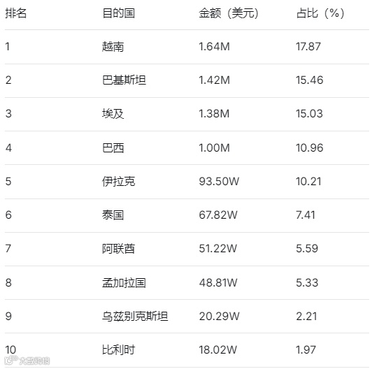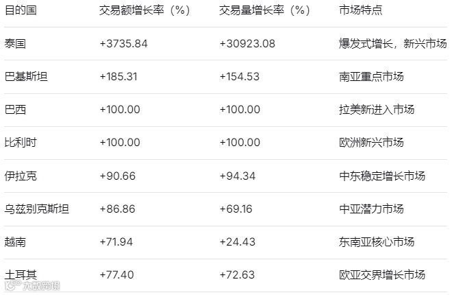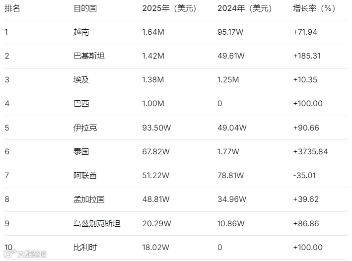 前 5 大市场(越南、巴基斯坦、埃及、巴西、伊拉克)合计占比 69.53%,市场集中度较高;泰国(3735.84%)、巴西(100%)等为新增 / 爆发式增长市场;阿联酋、乌克兰、蒙古等出现明显下滑。