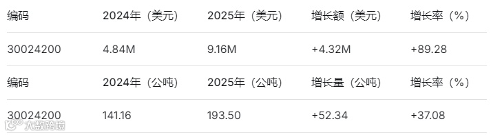 该编码产品(兽用疫苗)出口规模翻倍增长,交易额增长率(89.28%)高于交易量增长率(37.08%),反映产品单价有所提升,可能与产品升级、溢价能力增强相关。