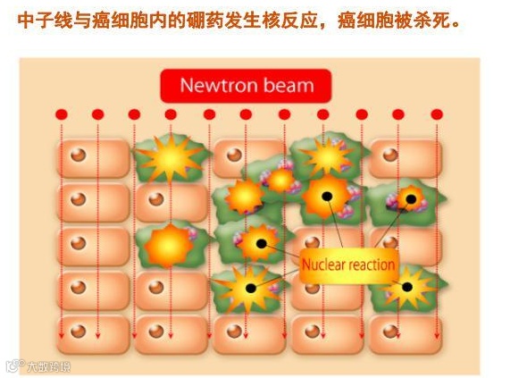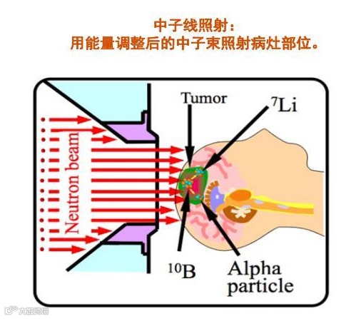 中子治疗即硼中子俘获治疗(Boron Neutron Capture Therapy,简称BNCT)。硼中子俘获治疗通过在肿瘤细胞内的原子核反应来摧毁癌细胞。它的原理是这样的:先给病人注射一种含硼的特殊化合物,这种化合物与癌细胞有很强的亲和力,进入人体后,迅速聚集于癌细胞内,而其他组织内分布很少。这种含硼化合物对人体无毒无害,对癌症也无治疗作用。这时,用一种中子射线进行照射,这种射线对人体的损伤不大,但中子与进入癌细胞里的硼能发生很强的核反应,释放出一种杀伤力极强的射线,这种射线的射程很短,只有一个癌细胞的长度。所以只杀死癌细胞,不损伤周围组织。这种有选择的只杀死形状复杂的癌细胞而不损伤正常组织的技术,称为硼中子俘获治疗技术。