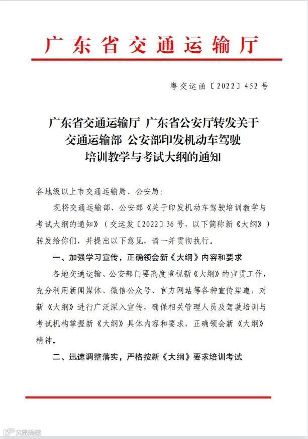 根据广东省交通运输厅的最新消息,8月10日,广东省交通运输厅、广东省公安厅,联合转发关于《机动车驾驶培训教学与考试大纲的通知》!