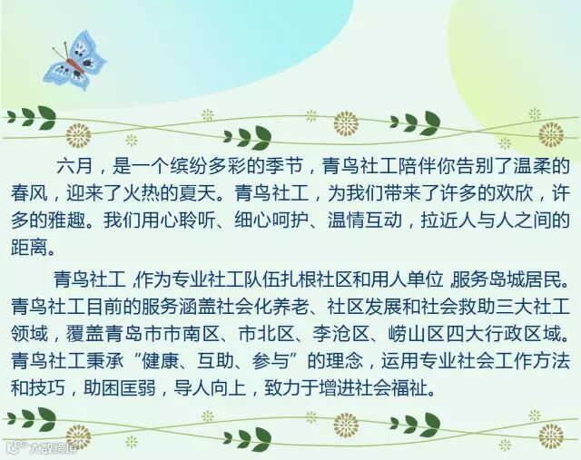 导读:六月,是一个缤纷多彩的季节,青鸟社工陪伴你告别了温柔的春风,迎来了火热的夏天。