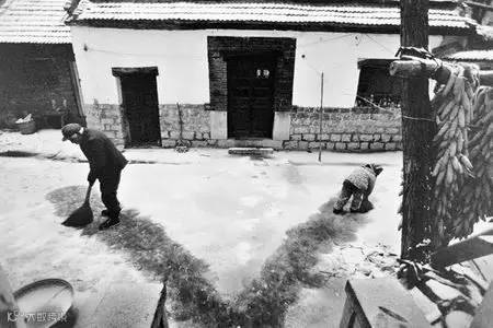 “老姥爷,你往那个门扫,我往这个门扫,看谁扫得快!”重外孙女晶晶和爹比赛扫雪。