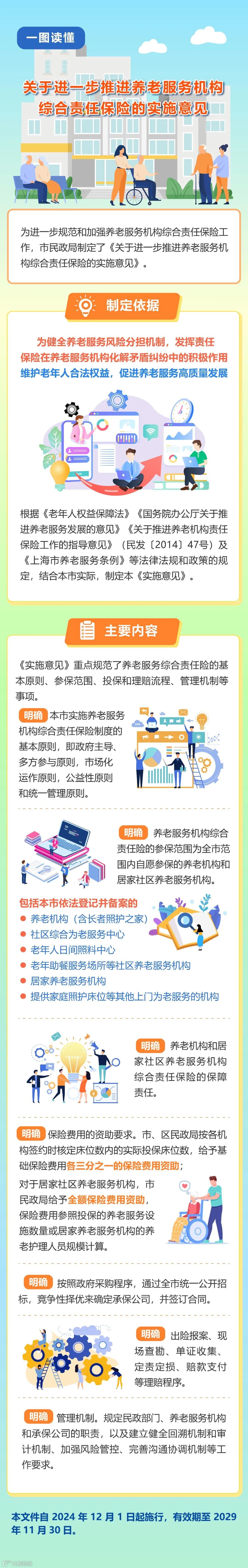 维护老年人合法权益是各级党委政府和社会各界广泛关心的重要工作。为了健全养老服务风险分担机制,发挥责任保险在养老服务机构化解矛盾纠纷中的积极作用,根据《老年人权益保障法》、民政部《关于推进养老机构责任保险工作的指导意见》以及《上海市养老服务条例》等文件精神,结合本市工作实际,上海市民政局出台了《关于进一步推进养老服务机构综合责任保险的实施意见》。详见↓