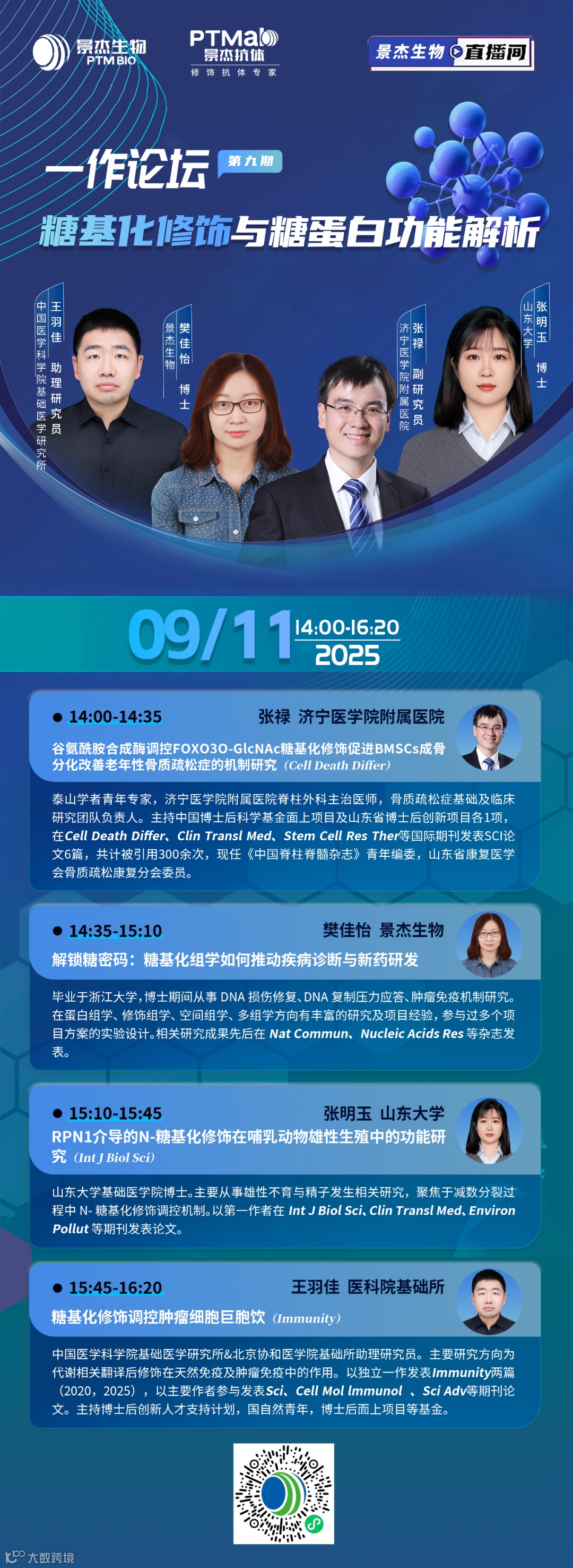 为进一步探索糖基化修饰的前沿应用,景杰生物将于2025年9月11日(周四)举办【一作论坛第九期!糖基化修饰与糖蛋白功能解析】线上直播,荣幸邀请到三篇研究的一作,分别为济宁医学院附属医院的张禄副研究员、中国医学科学院曹雪涛院士团队王羽佳助理研究员和山东大学刘洪彬教授团队张明玉博士,携手景杰生物高级产品经理樊佳怡博士带来精彩报告。诚邀您共同参与!