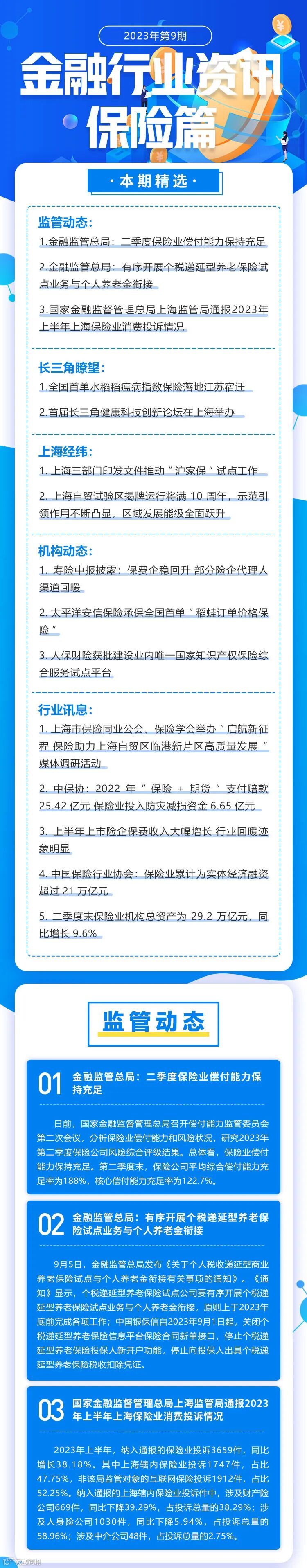 导读:金融监管总局:二季度保险业偿付能力保持充足金融监管总局:有序开展个税递延型养老保险试点业务与个人养老金衔接国家金融监督管理总局上海监管局通报2023年上半年上海保险业消费投诉情况