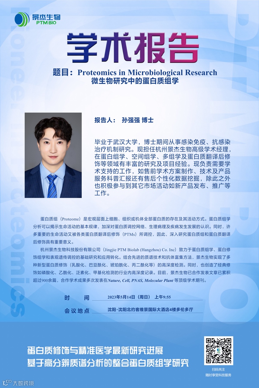 景杰生物在五月份将参展3场领域内重磅会议,我们的科研服务天团(资深技术销售工程师、学术经理、产品经理)将在展位帮助广大客户朋友解答蛋白质组学及翻译后修饰组学技术在选题、前沿思路、方案设计以及数据挖掘等实际应用中碰到的问题。机会难得、时间有限,快快扫码填写表单预约,欢迎来景杰生物展位进行交流!
