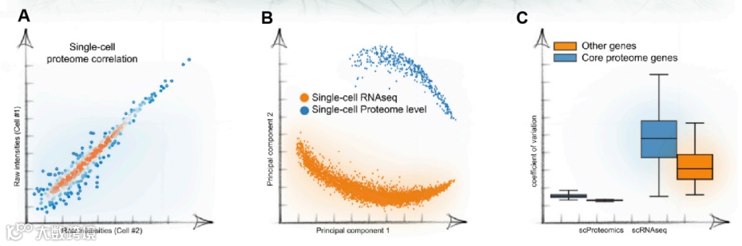 与其他空间组学技术相比,空间转录组学通过高度多重荧光原位杂交 (FISH) 或基于测序的方法来获取空间信息,并基于转录组信息推断蛋白质的表达状态。然而mRNAs 和它们的同源蛋白之间的翻译,是高度调节和非线性的,RNA 表达并不能直接预测蛋白质表达。转录本表达与蛋白质相比具有更高的随机性,与同源 mRNA 相比,蛋白质的变异系数要低得多(下图2)[1]。因此