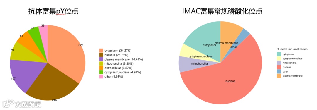 图4 抗体富集pY位点与IMAC富集常规磷酸化位点的亚细胞定位和生物学过程比较