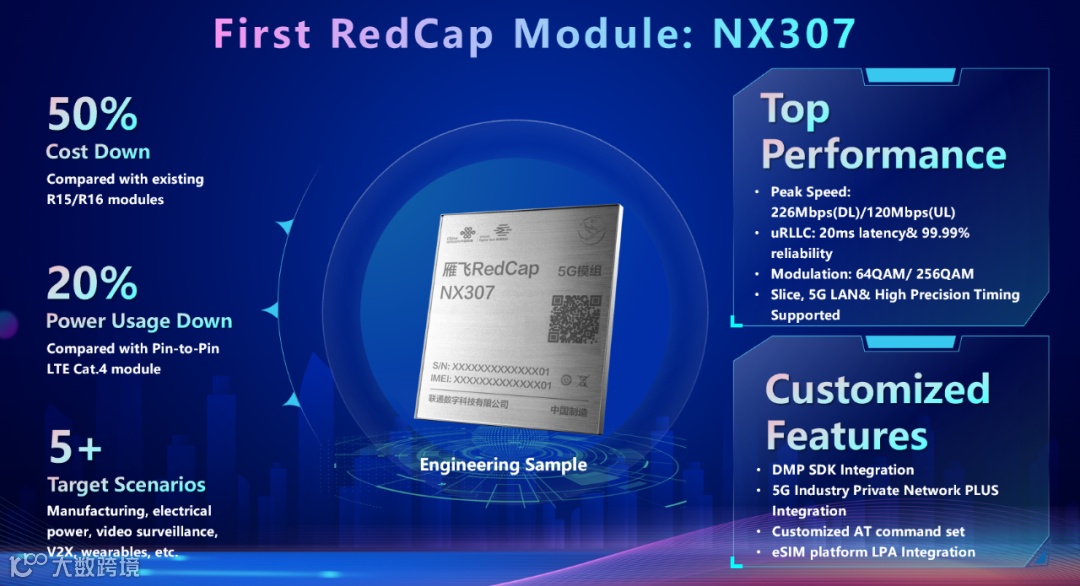 ——端网业融合:NX307模组集成了中国联通格物DMP平台、智连CMP平台SDK,实现了开机上云、5G端网融合等能力预埋,高效使能行业差异化应用,推动“端网业”一体化发展。同时,该模组与联通5G专网PLUS系列产品能力深度适配,具备场景化专网定制化特性。