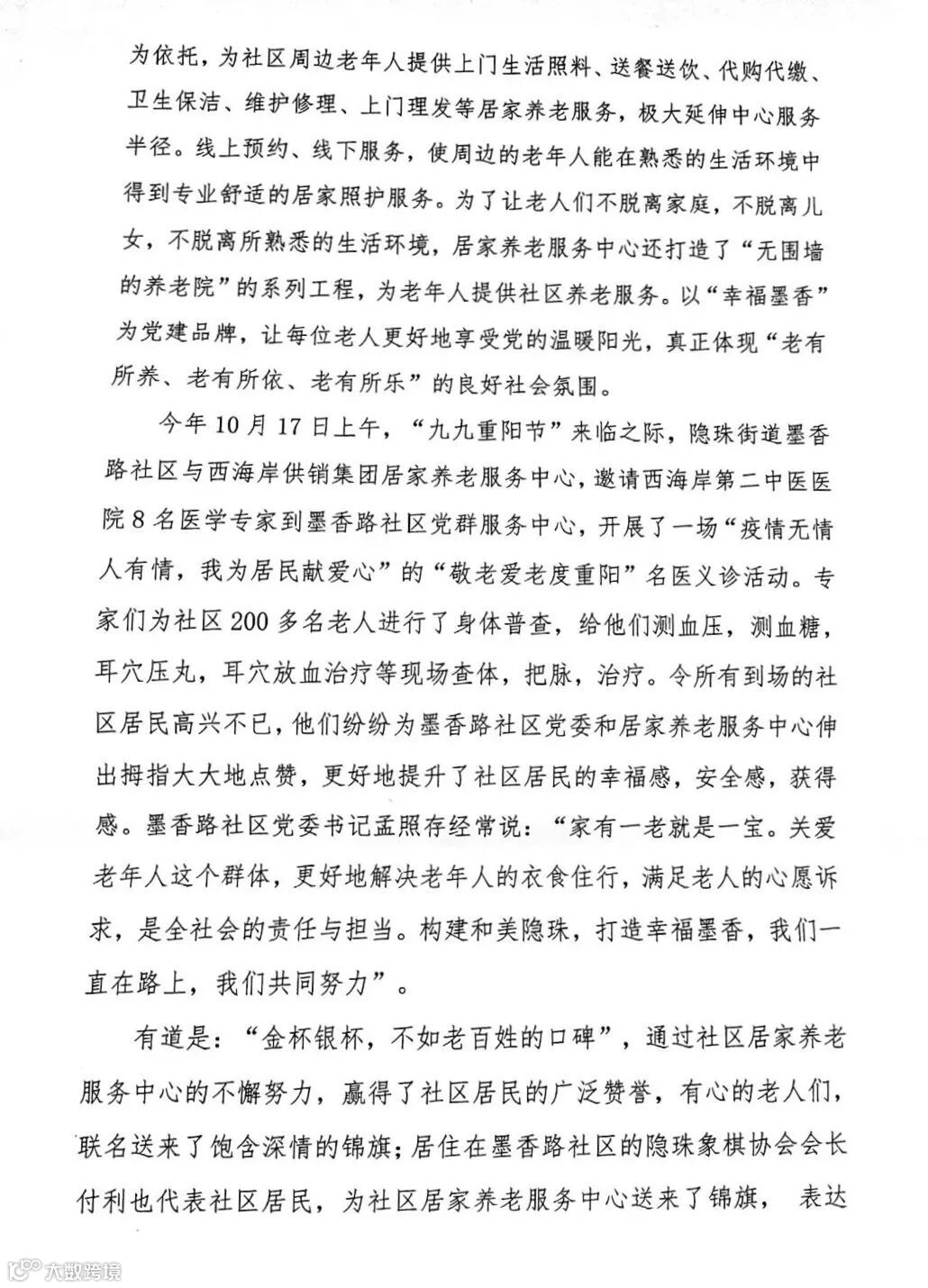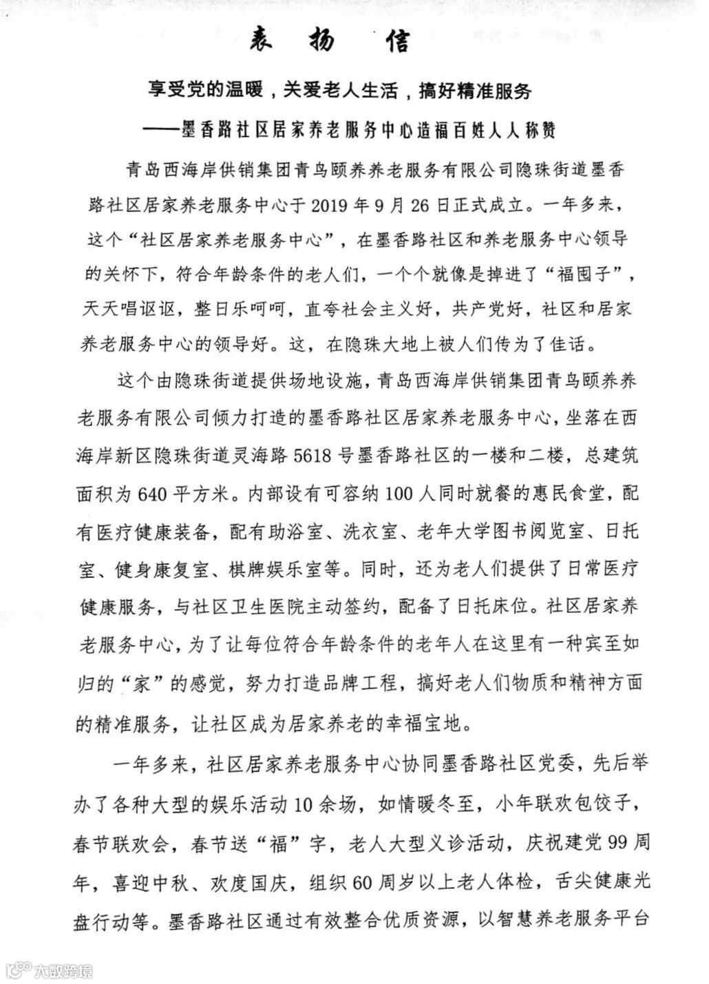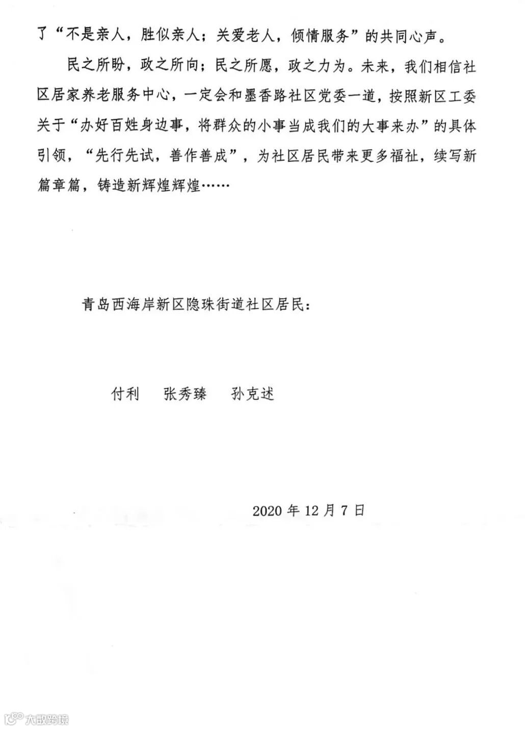 12月7日,西海岸供销集团青鸟颐养养老服务有限公司收到了一封来自隐珠街道社区居民的感谢信,信中对西海岸供销集团青鸟颐养隐珠街道朝阳山管区居家社区养老服务中心的助老服务做出了高度评价!