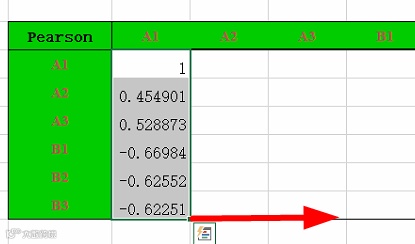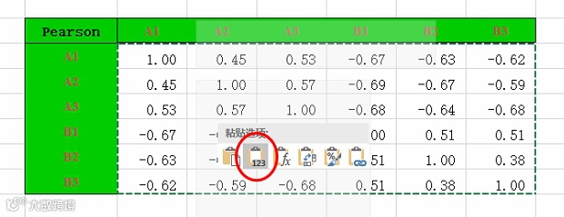 1.首先,我们需要去除公式,即将带有公式的数据复制后粘贴成数值的格式(如下图所示),对应的相关性系数分布在