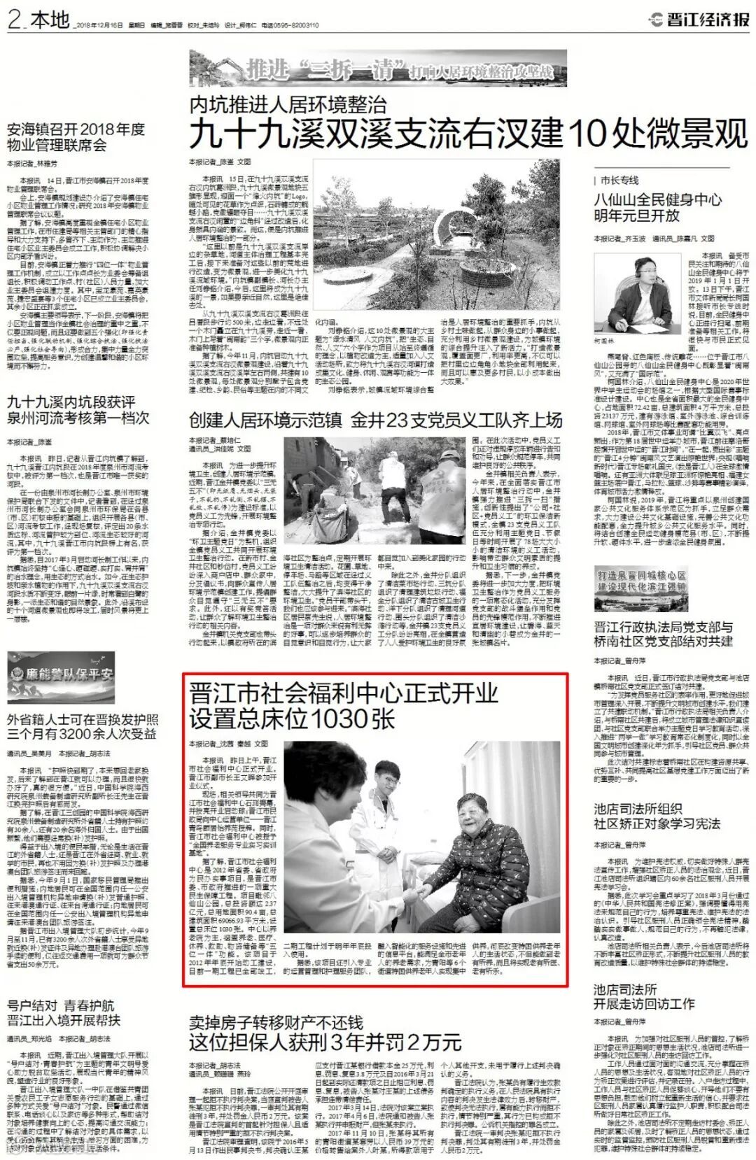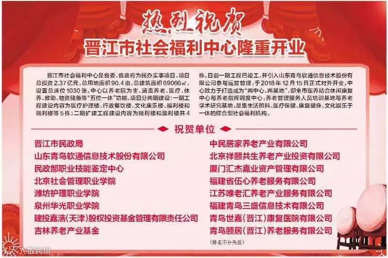 2018年12月15日上午,由晋江市民政局主建、通过公开招投标的形式、以公建民营的运营管理模式委托山东青鸟软通信息技术股份有限公司负责运营的晋江市社会福利中心开业仪式隆重举行,这也拉开了晋江市养老产业的序幕。