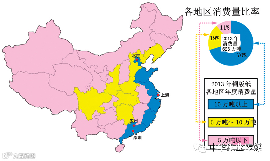 中国铜版纸的生产量和消费量至2012年为止都一直在增长,但2013年生产量和消费量都有所下降。图为王子制纸所调查的中国大陆地区的铜版纸的消费量。地图上的蓝色部分占了整体(全国)消费量的70%,这些区域消费量已经处于饱和状态,应该不会有太大的增长希望。就内陆地区而言,随着经济的发展,生活水平的提高,今后也许会有一定程度的增长。