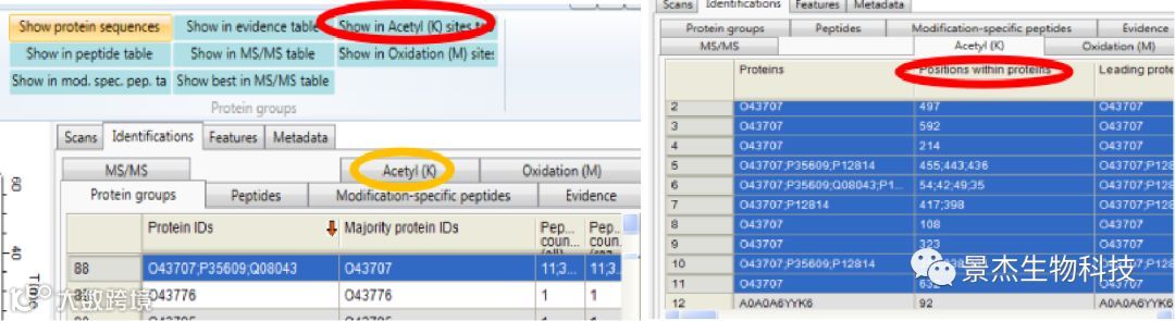 2-2 从Protein groups中找到目的蛋白,单击Shown in Acetyl(K)sites table,再单击Acetyl(K)从表中可以看出该蛋白所有发生修饰的位点,从Positions with proteins列可以查找到目的位点。(此处以乙酰化为例)