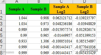 针对删除之后的两个样本的蛋白相对定量值做Log2对数转换,得到C列和D列数据。