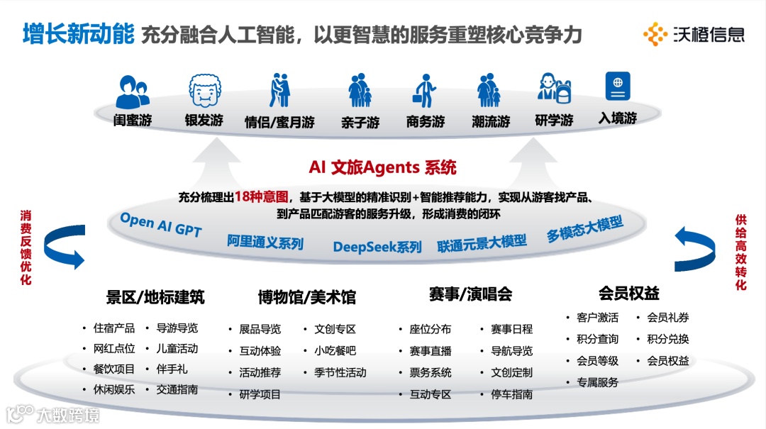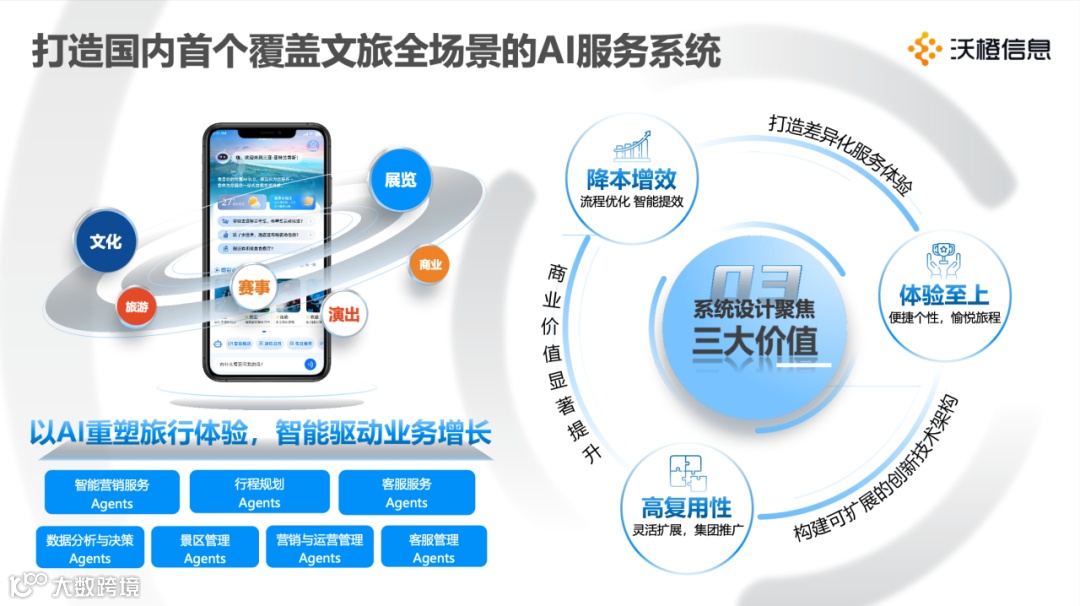 沃橙信息凭借其在AI领域的深厚积淀,构建了覆盖文旅全场景的AI智能服务系统。该系统以AI Agents为核心,聚焦IP与内容运营、全旅程智能服务、数智营销以及会员体系打通,旨在为垂类企业注入一体化、智能化、全球化新动能。