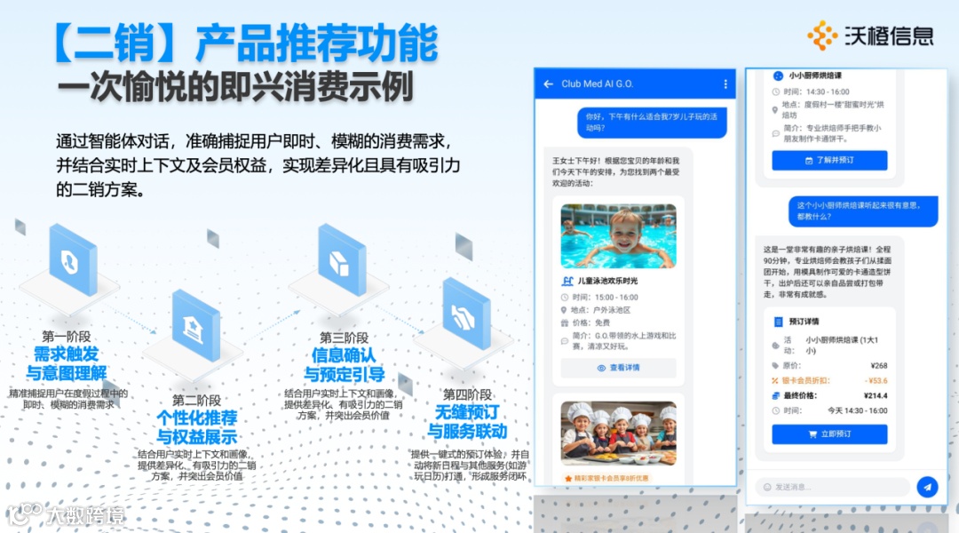 方案通过AI深度融合营销,数据驱动变现,实现精准营销与资源高效利用。从用户画像生成到精准识别犹豫客户,再到智能推荐二销产品,沃橙AI智能体能够精准捕捉需求,主动挖掘需求,驱动精准推荐与复购转化,有效释放旅游消费潜力。