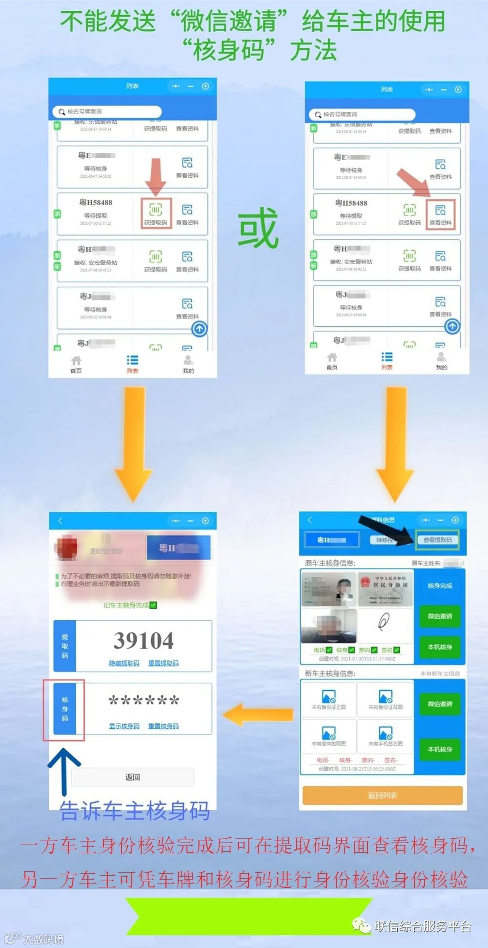 温馨提示:一方车主身份核验完成后可在提取码界面查看核身码,另一方车主可凭车牌和核身码进行身份核验