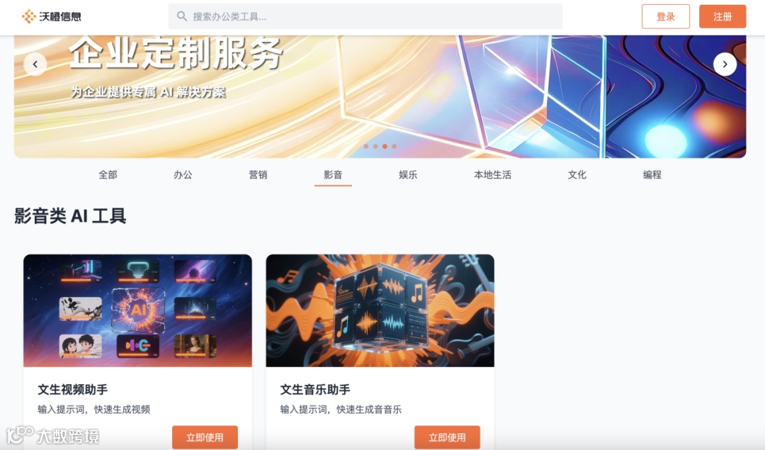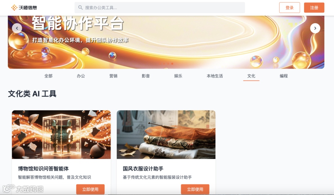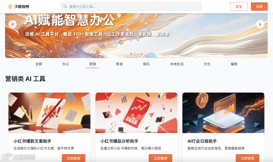 从办公效率到创意营销,从影音制作到文化传承,沃橙信息AI工具平台实现了多领域的全面覆盖,满足用户在不同场景下的智能化需求。