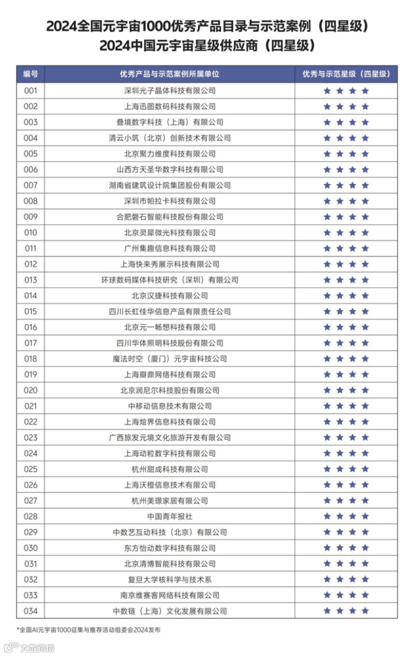 大会重磅发布了全国元宇宙1000征集项目的示范星级榜单。今年10月24-25日,文化元宇宙专委会牵头组织举办了全国元宇宙1000优秀产品示范案例与星级供应商路演活动,来自澳门、北京、上海等全国15个省市自治区相关企事业单位参加了路演展示。元宇宙相关领域一流的学术专家、产业专家、媒体专家和投资专家对路演项目进行了科学严格的评审与星级推荐,最终确定82家申报单位入围星级榜单,其中荣获2024全国元宇宙1000示范三星级单位36家、四星级34家、五星级12家。(后附全国元宇宙示范星级榜单)