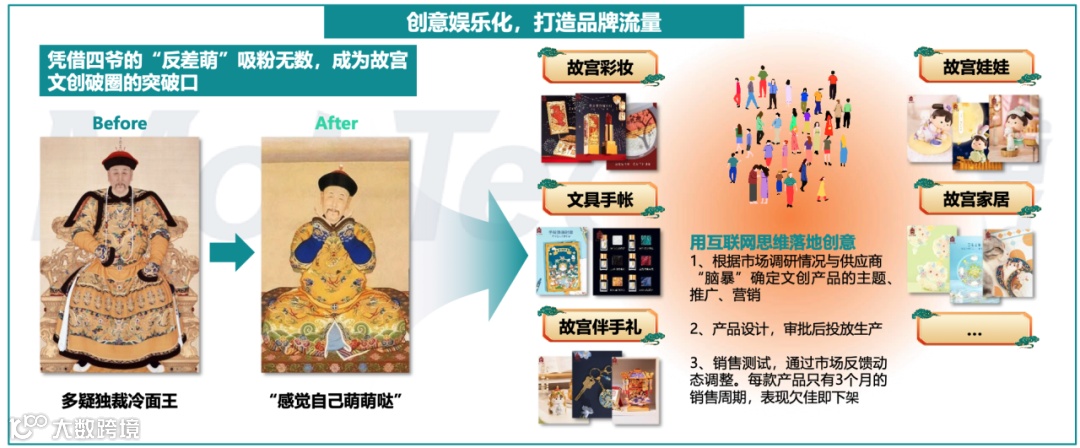故宫文创借助其深厚的藏品底蕴,用互联网思维以“井喷式”的出新速度迎合不同年龄、不同性别的受众;紧跟潮流趋势,持续做“有态度”的产品设计,打造爆品收割机。