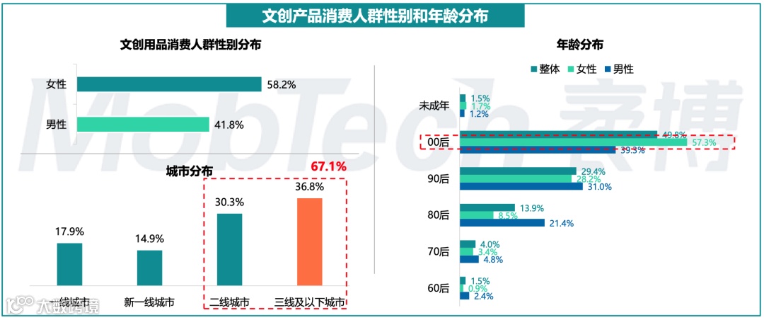 分性别看,文创用品消费人群中女性占比58.2%;分年龄看,00后是消费主力军,占49.8%;分城市看,二、三线及以下城市消费者占据重要比例。