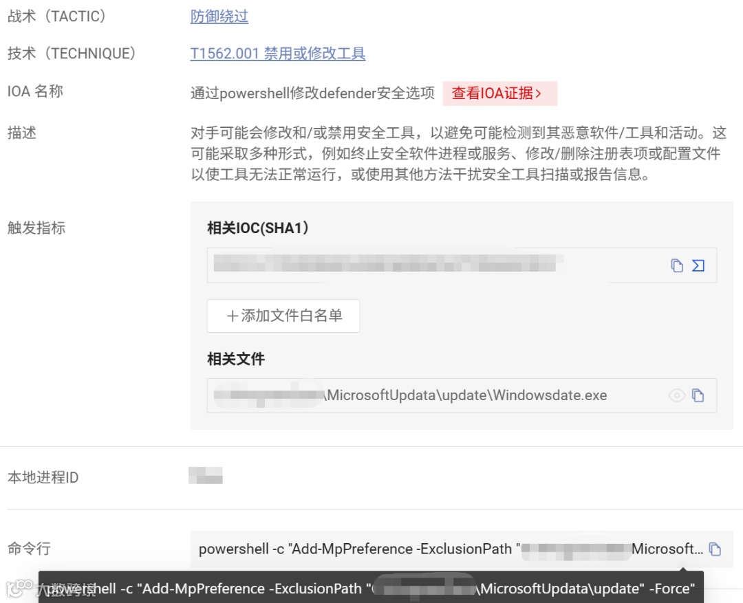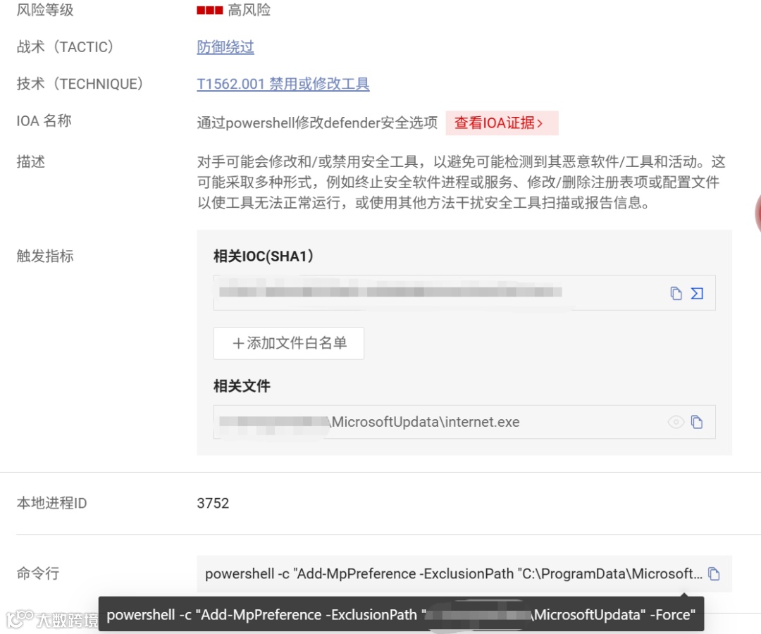 internet.exe 加载了 RexRat 远控木马的登录模块,并通过调用 PowerShell 命令,将相关路径添加至 Windows Defender (用于防御规避)的扫描排除项中,实现免杀,逃避安全软件的检测。