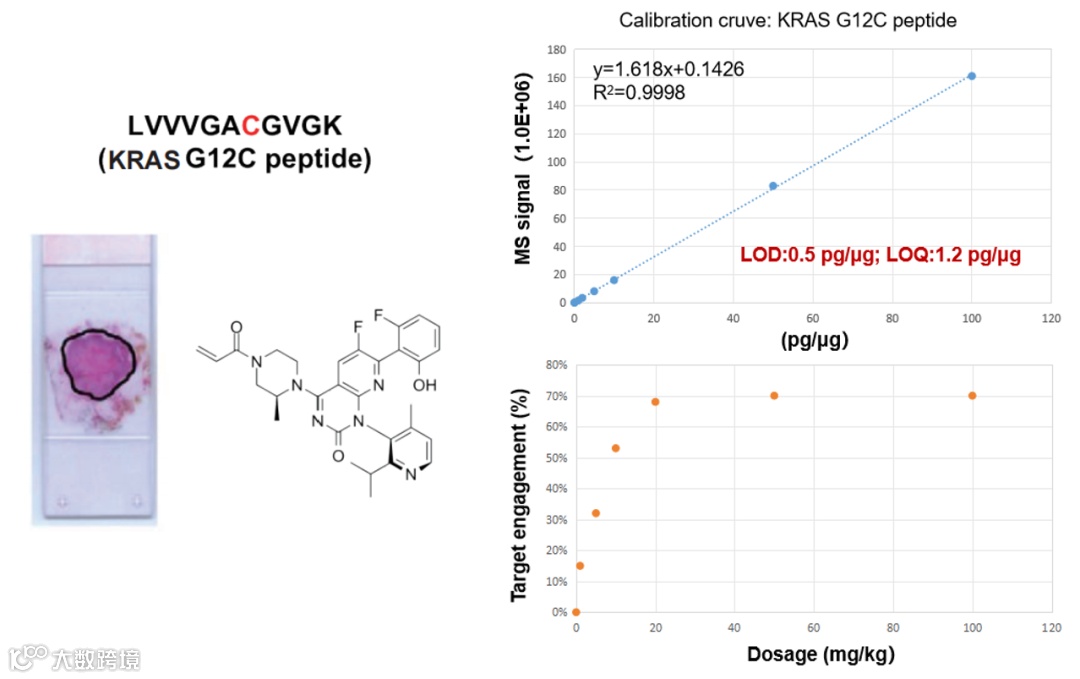 该案例中检测对象为KARS G12C,目的为评价待测药物在该靶点的占有率。由于没有相关抗体,PRM是一种有效的检测手段。重标肽的标准曲线显示PRM方法具有高灵敏性,检测下限可达0.5 pg/μg,定量下限可达1.2 pg/μg。在药物处理后,针对KRAS G12C目标肽段,结果显示随着药物浓度的增加,在20 mg/kg剂量达到阈值平台,KARS G12C靶点占有率达70%。