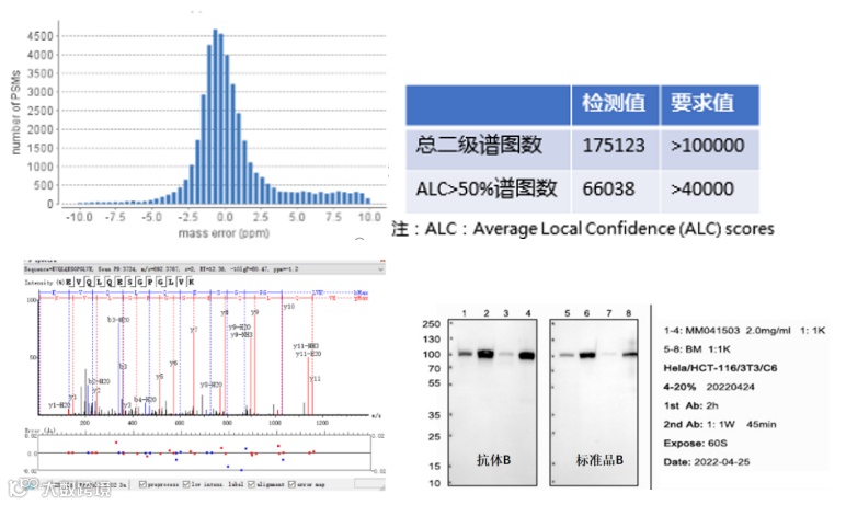 该抗体测序案例将抗体B酶解后的片段进行质谱检测,首先是进行质控,从结果可以看到,无论是总二级谱图数还是平均置信区间(Average Local Confidence,ALC)>50%谱图值均满足检测和分析要求。接着通过质谱检测全局的肽段信息,进行de novo测序和AI算法拟合拼接生成完整氨基酸序列,实现抗体100%全覆盖序列检测。获得抗体B序列后,重组纯化验证其效价与标准品一致,进一步证实抗体测序的准确性和抗体的有效性。
