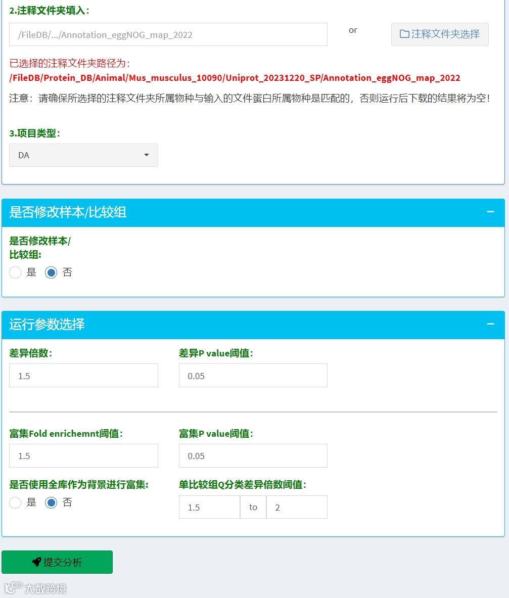 1.上传蛋白表达谱文件和分组文件,具体格式可参数示例文件。选择注释文件夹(可在生物信息学标准分析报告的“生物信息学方法”部分找到),并选择项目类型和其他参数。若在景杰做过组学项目,可直接输入项目标准分析中“2-Basic_analysis”文件夹下MS_identified_information.txt和repeat_list文件。