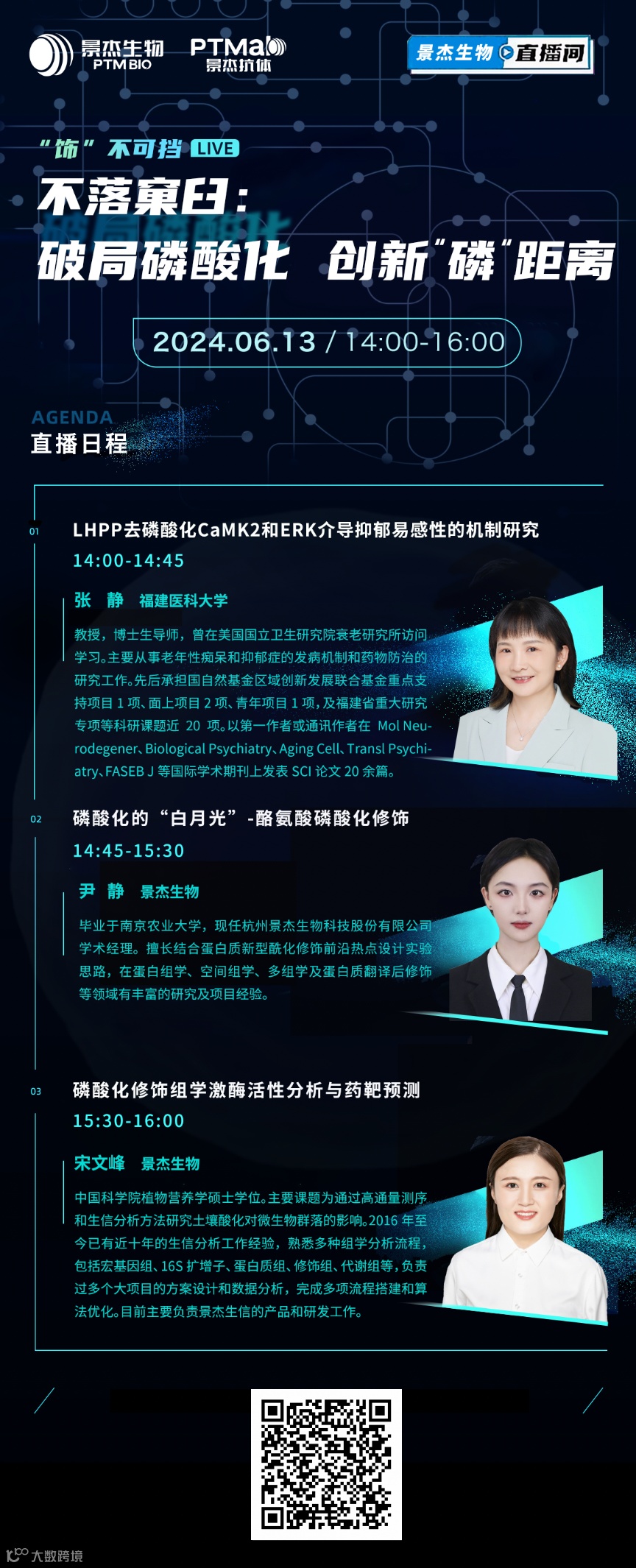 磷酸化修饰研究如何创新选题才能“不落窠臼”?如何结合磷酸化最新技术加速创新研究?如何利用磷酸化修饰数据从中挖掘有效信息?为进一步促成领域交流与合作,景杰生物将于2024年6月13日举办【“饰”不可挡系列直播——不落窠臼:破局磷酸化,创新“磷”距离】。特邀福建医科大学张静教授、景杰生物高级学术经理尹静和高级生信产品经理宋文峰分享磷酸化修饰最新前沿技术应用与成果,从前沿进展、修饰组学技术及案例、生物信息学分析等多个角度开展磷酸化修饰组学的研究,诚邀您一同参与!