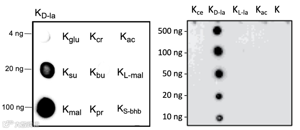 Dot blot 结果显示D-乳酸化修饰抗体与其他酰化修饰(如乙酰化/巴豆酰化/琥珀酰化等)不存在交叉结合(图左)。D-乳酸化修饰抗体与其同分异构体(L-乳酸化/羧乙基化)不存在交叉结合(图右)。