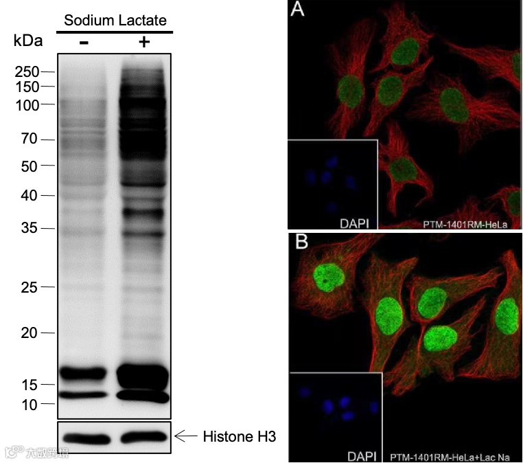乳酸钠处理后,细胞中增强的L-乳酸化修饰可以在WB或者免疫荧光实验中被 L-乳酸化修饰抗体检测到,体现出绝佳的抗体特异性。