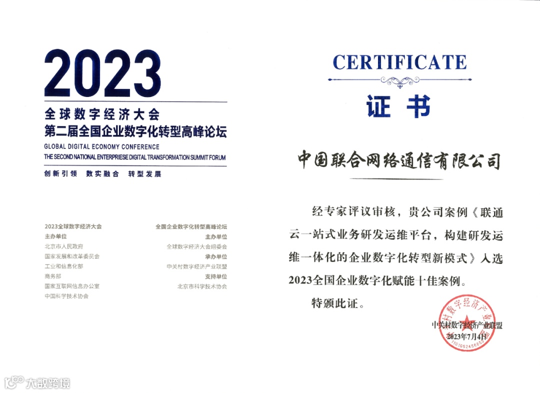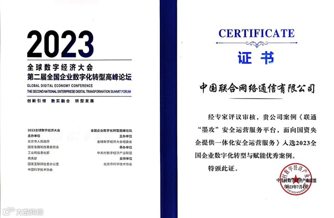 7月4日至7日,2023全球数字经济大会第二届全国企业数字化转型论坛在京举办。论坛期间发布了《2023全国企业数字化转型与赋能典型案例研究》蓝皮书,遴选全国300余项企业数字化转型与赋能案例,联通数科两项案例入选:
