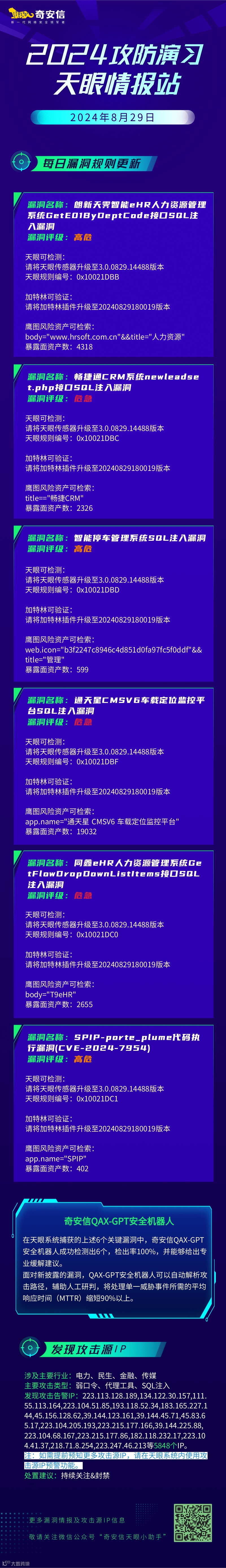针对上述天眼捕获漏洞,鹰图平台统计了相关资产风险暴露面情况,8月26日至8月30日期间,约1108293个互联网资产可能存在此类漏洞风险。