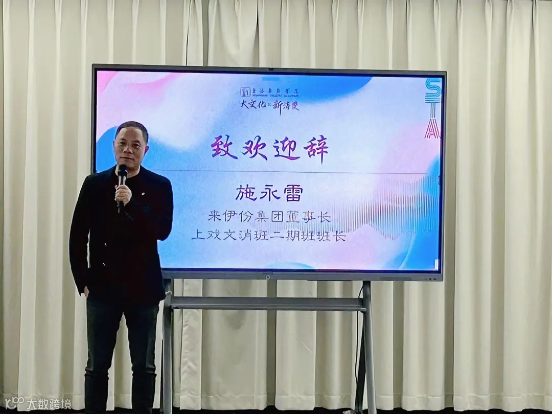 参观结束后来伊份董事长、上戏文消班二期班班长施永雷热情开场,他提到来伊份在新营销领域的创新实践令人瞩目。他介绍来伊份不仅是一家零食企业,更是科技型、管理体系性的企业。从15年建成的物流中心到后来的零食博物馆,来伊份不断提升品牌厚度。如今,来伊份正进行转型升级,2.0生活店和仓储店的布局,搭配APP构建起立体型私域体系,适应零售业到店率下滑的趋势。施班长还表示希望与各位合作伙伴资源协同,共同发展。