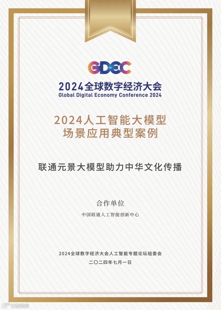 由中国外文局文化传播中心、中国文艺网、中国联通人工智能创新中心、上海沃橙信息技术有限公司基于联通元景大模型联合打造的“中华器灵”创作平台,凭借其创新性与独特的文化价值,作为“联通元景大模型助力中华文化传播”案例,成功入选典型案例。