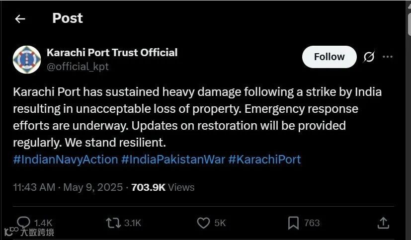 巴基斯坦卡拉奇港务局官方账号发布印度海军对港口造成严重破坏后,也出现了类似的情况。卡拉奇港务局在X上的帖子写道,“卡拉奇港在印度的袭击后遭受严重破坏,造成了难以接受的财产损失。紧急响应工作正在进行中。我们将定期更新修复进展。我们坚韧不拔。”