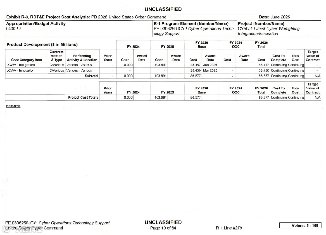 2025财年无拨款,2026财年拨款0.3843亿美元。此次增加的资金反映了从JCWA集成项目向JCWA创新项目转移3800万美元,以支持“星座”计划/DARPA能力工作的持续发展。此次转移将集中美国网络司令部内部审批和优先安排科技工作量的职责。