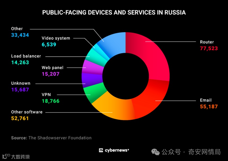 俄罗斯面向公众的设备大部分(25%)是路由器,其次是电子邮件服务器(20%)、VPN(6%)、网络面板和负载均衡器(各占5%)。