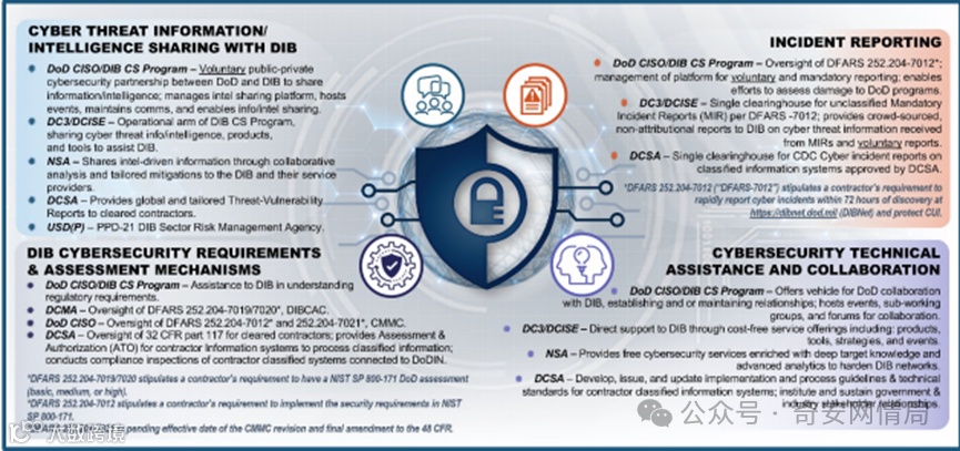 为了鼓励DIB中的网络安全最佳实践,美国防部采用多管齐下的方法,包括建立公私合作,例如自愿的国防部DIB网络安全计划;促进、扩大和采用NIST标准、框架和指南;以及与行业协会就网络安全、培训和实施进行合作,同时保持DIB承包商识别信息的匿名性。美国国家网络安全战略认为“强有力的合作,特别是公共和私营部门间的合作”是“确保网络空间安全的关键”。美国防部与DIB协调,力求建立和完善法规、政策、要求、计划、服务、试点、利益共同体、公私合作和机构间努力的结合,以实现更加网络安全和有弹性的DIB。