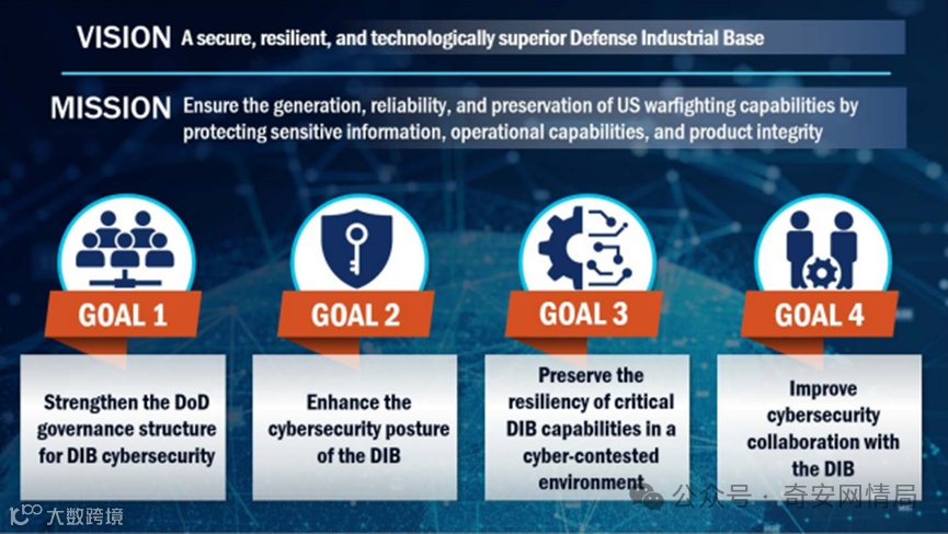 为支持这一使命,美国防部将与众多部门、项目管理者和DIB协调,力求实现四个主要目标。支持本战略中提到的目标的许多努力已经开始,或者已经成为国防部数十年或更长时间的DIB网络安全方法的一部分。本战略旨在加强这些努力的重点、协作和整合,最终提高美国国防网络安全生态系统的弹性。