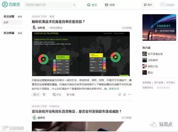 同样的,百度派也会在首页根据用户习惯,推送用户感兴趣的话题。不同的是,知乎更加注重文字内容,而百度派推送的是标题+大图+简介的类似新闻的形式,更加突出图片内容。不过,锋观点也发现,百度派推送的问答话题,在知乎中也能找到类似的。比如这篇《魅族机海战术究竟是自救还是自毁?》的话题,在知乎中存在 4 个类似的话题。