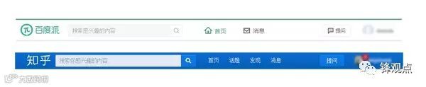 锋观点在对比百度派与知乎后发现,两者在产品定位、功能、结构及布局几乎一致。比如导航条上分别都有 LOGO 、搜索框、首页、消息、提问及用户账号,只不过百度派将话题标签移到了左边栏,另外还有一点不同就是导航条的颜色不一样。